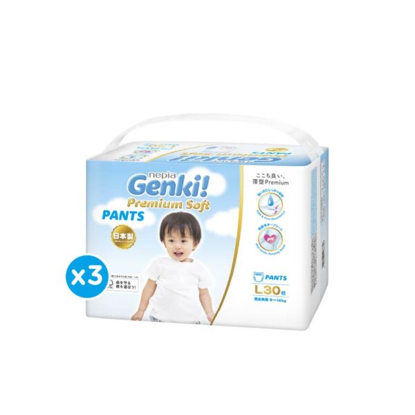 (3 Pack) Nepia Genki Popok Bayi Pants Popok Celana Bayi Diapers Premium Soft L30. Kelembutan dari Nepia Genki Premium Soft Pants cocok digunakan untuk si Kecil yang masih memiliki kulit sensitif agar terhindar dari iritasi. Dengan daya serap yang tinggi, Nepia Genki Premium Soft Pants mampu mencegah terjadinya bocor saat si Kecil beraktivitas di siang dan malam hari. Desain yang dirancang untuk membalut ukuran pinggang si Kecil dengan bahan lembut, membuat si Kecil semakin nyaman menggunakan popoknya tanpa khawatir rewel.