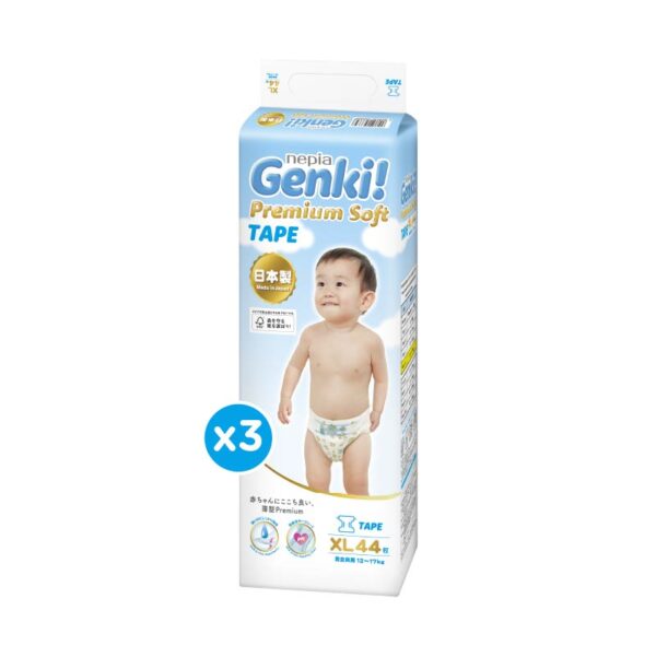 (3 Pack) Nepia Genki Popok Bayi Tape/Perekat Bayi Diapers Premium Soft XL44. Kelembutan dari Nepia Genki Premium Soft Tape cocok digunakan untuk si Kecil yang masih memiliki kulit sensitif agar terhindar dari iritasi. Dengan daya serap yang tinggi, Nepia Genki Diaper Tape mampu mencegah terjadinya bocor saat si Kecil beraktivitas di siang dan malam hari.