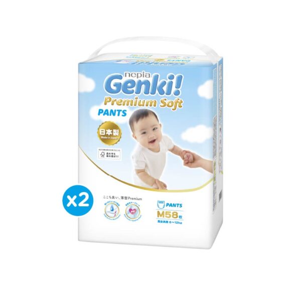NEPIA GENKI Pants Popok Celana Bayi Premium Soft M58 – Twin Pack. Kelembutan dari Nepia Genki Premium Soft Tape cocok digunakan untuk si Kecil yang baru lahir dengan kulit yang masih sensitif agar terhindar dari iritasi. Dengan daya serap yang tinggi, Nepia Genki Diaper Tape mampu mencegah terjadinya bocor saat si Kecil beraktivitas di siang dan malam hari.