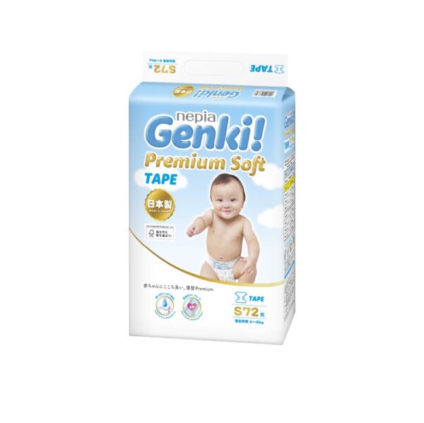 Nepia Genki Popok Bayi Tape / Perekat Bayi Diapers Premium Soft S72. Kelembutan dari Nepia Genki Premium Soft Tape cocok digunakan untuk si Kecil yang baru lahir hingga tumbuh besar dengan kulit yang masih sensitif agar terhindar dari iritasi. Dengan daya serap yang tinggi, Nepia Genki Premium Soft Tape mampu mencegah terjadinya bocor saat si Kecil beraktivitas di siang dan malam hari.