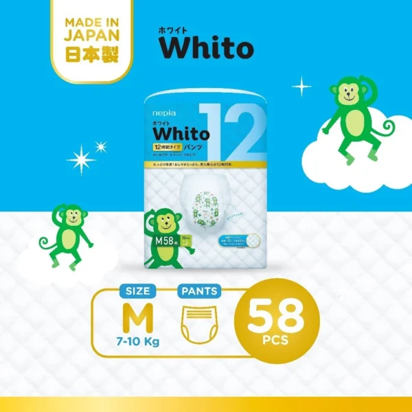 Nepia Whito Diapers Pants M58 – Popok Celana Bayi. Nepia Whito adalah premium diapers dengan teknologi merajut pertama. Teknologi rajutan ini dapat meningkatkan penyerapan air & sirkulasi udara 3x lebih baik dibandingkan popok lain yang tidak menggunakan teknologi rajutan. Nepia Whito juga dapat digunakan hingga 12 jam (jika bayi tidak buang air besar).